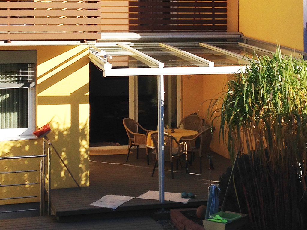 Terrassenüberdachung unter eine Balkonplatte eingebaut und zwischen 2 Baukörper in einer Reihenhaussiedlung.